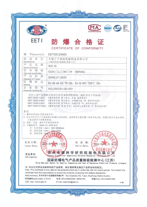 Недавно основной продукт компании Wuxi Huiqian Logistics Machinery Manufacturing Co., Ltd. — роликовый конвейер — успешно прошел строгие испытания и официально получил сертификат взрывобезопасности EETI! Этот сертификат означает, что взрывозащищенные характеристики роликовых конвейеров Huiqian соответствуют международно признанным стандартам безопасности, обеспечивая более надежное решение для обработки материалов в отраслях с высоким уровнем риска, таких как нефтехимия, добыча угля, фармацевтика и военная промышленность, а также демонстрируя сильные технические возможности компании в области взрывозащищенного логистического оборудования.